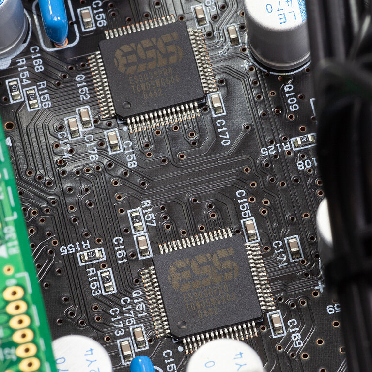 Die ESS-DACs sind links und rechts getrennt angeordnet. Dadurch arbeiten die Kanäle mit eigenständiger Umsetzung und Versorgung, was die Kanaltrennung unterstützt und die Stromausgangs-Ressourcen der ES9038PRO konsequent nutzbar macht.