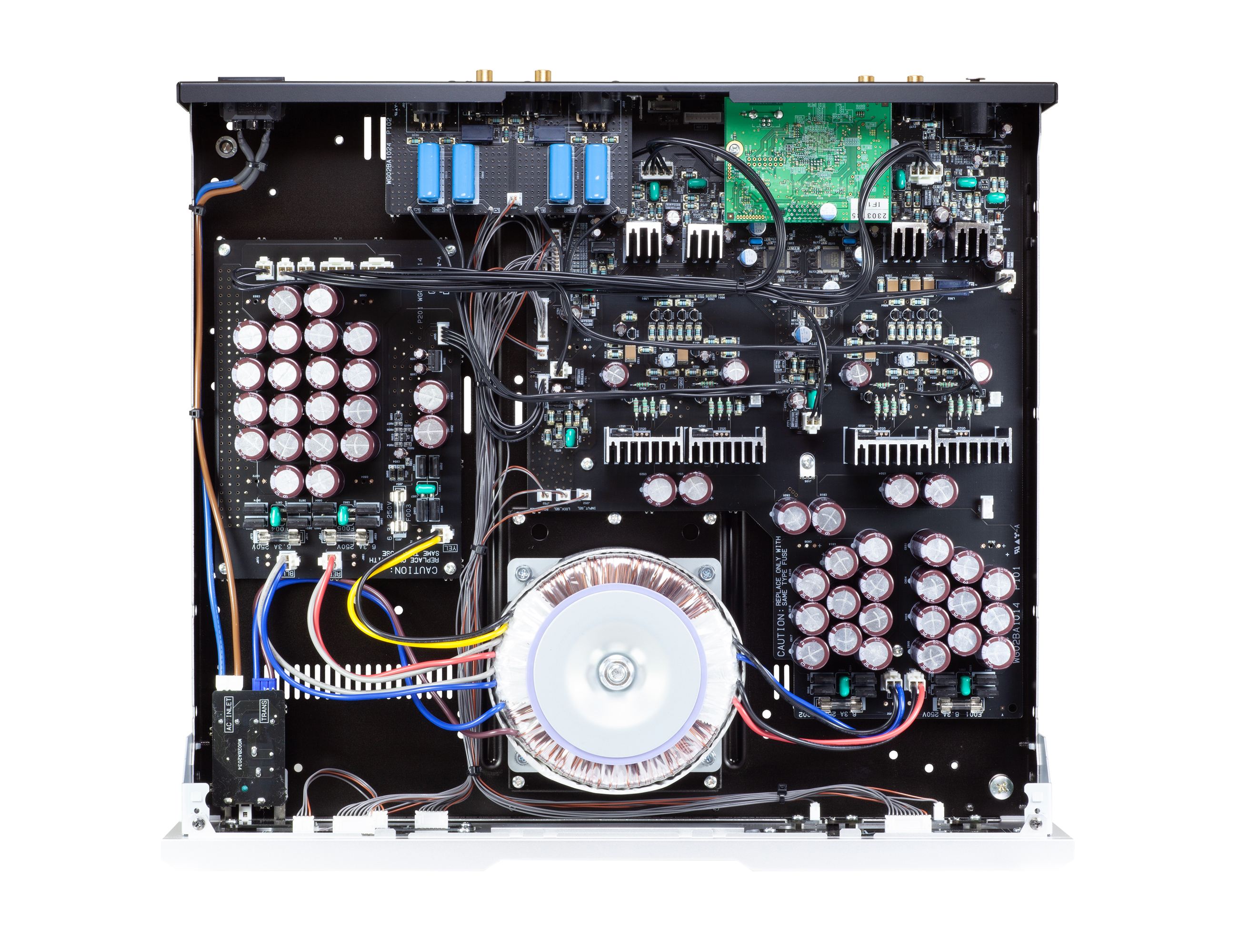 Als Leistungstransformator wird ein großer, nicht imprägnierter 260-VA-Ringkerntransformator eingesetzt. Die Stromversorgung ist auf ein leistungsstarkes, diskretes Konzept ausgelegt. Für die rückkopplungsfreie Verstärkersektion sind dabei vergleichsweise hohe Versorgungsspannungen vorgesehen (±43 V), um eine Kombination aus kräftiger Wiedergabe und feiner räumlicher Differenzierung zu unterstützen.