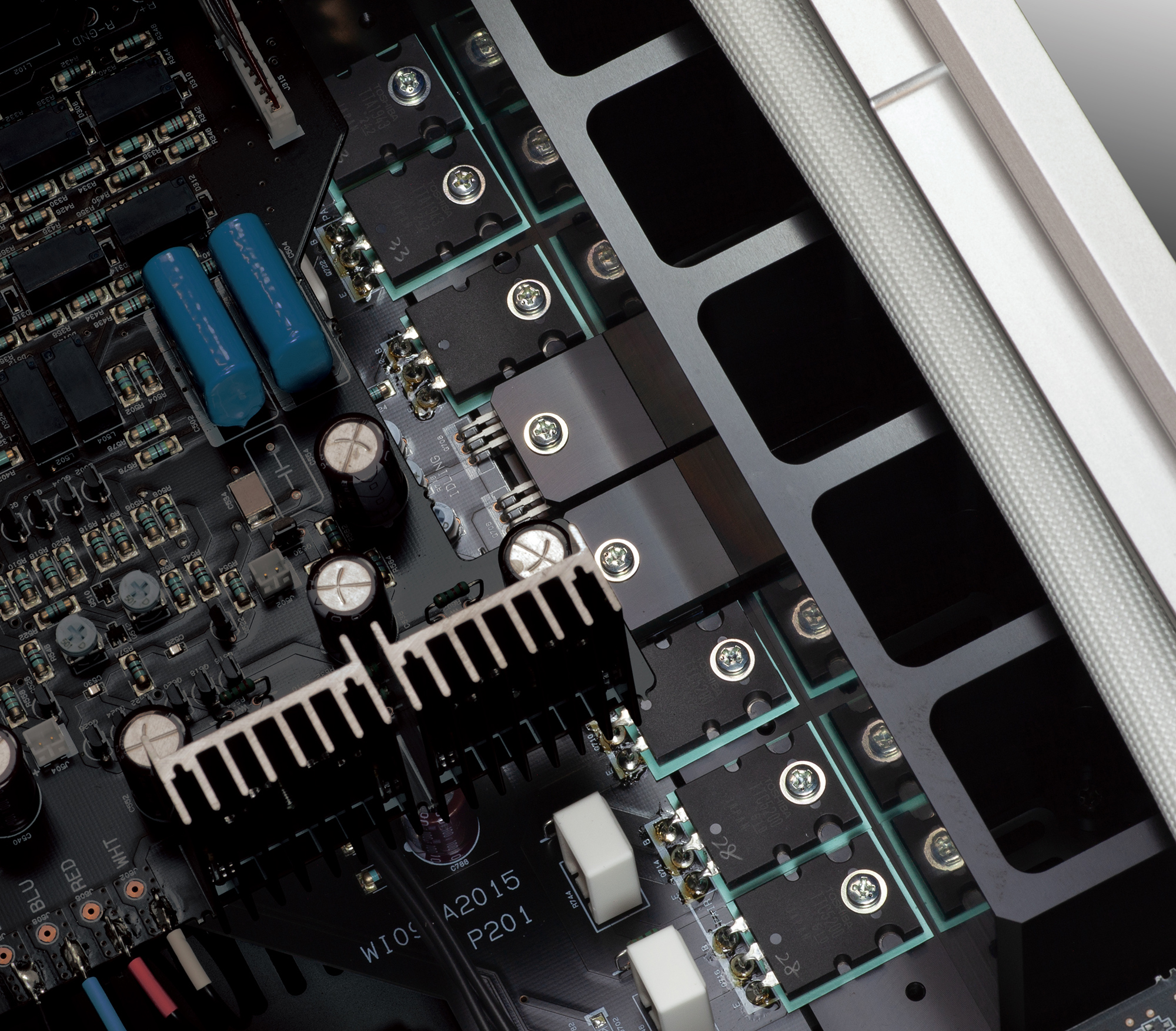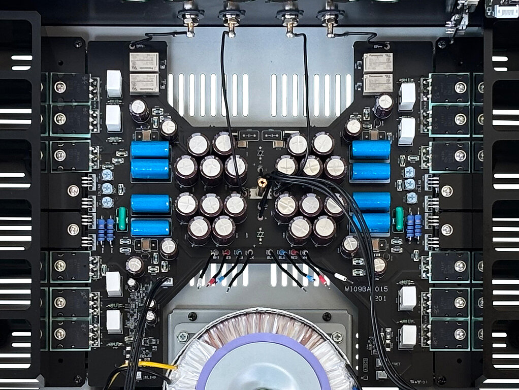 Die Ausgangsstufe arbeitet als parallele Push-Pull-Schaltung mit schnellen, hoch belastbaren TO-3P-Transistoren (wie im A-3). Die Transistoren der Ausgangsstufe sind präzise nach hFE selektiert und gepaart. Dadurch werden typische Begleiterscheinungen paralleler Push-Pull-Topologien, wie ungleichmäßige Stromaufteilung und Übernahmeeffekte, wirkungsvoll reduziert.