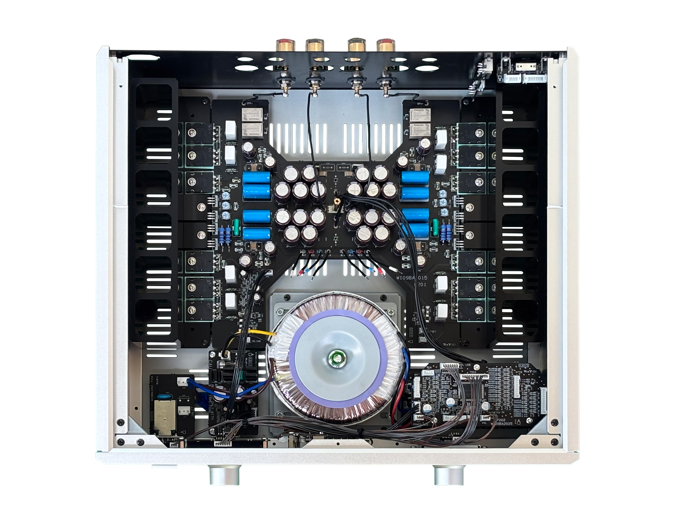 Zur Minimierung der Eingangssignalleitungen sind Eingangsanschlüsse, Eingangswahlschalter, Lautstärke und die rückkopplungsfreie Spannungsverstärkungsstufe auf einer einzigen Mehrlagenplatine konzentriert. Einflüsse durch Vibrationen von Verbindungskabeln, Induktivitäten und abgestrahltes Rauschen werden ohne zusätzliche Schirme oder Filter minimiert, die den Klang beeinträchtigen könnten. Diese Integrationsdichte wird auch durch den relaisgeschalteten, symmetrischen Dämpfer ermöglicht.